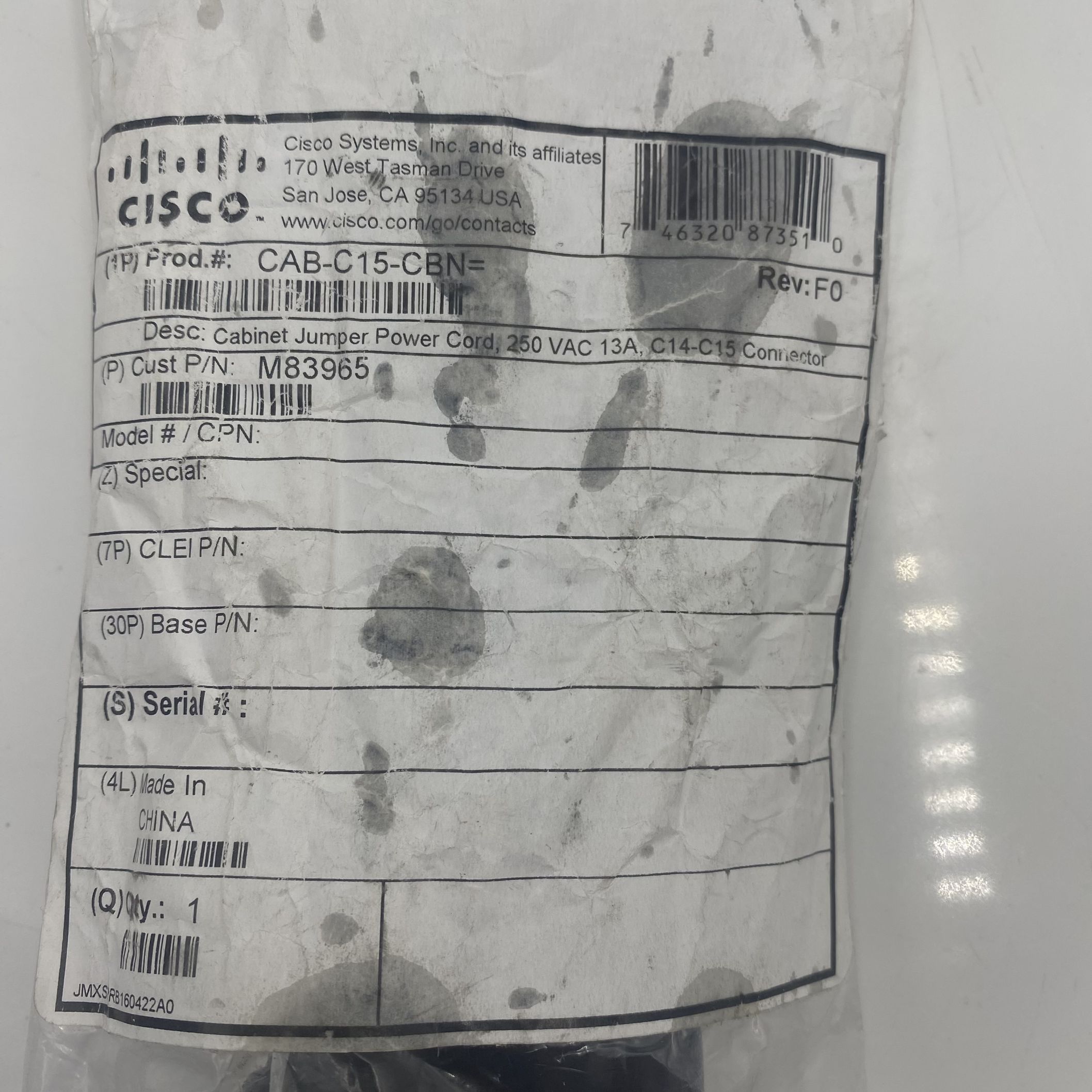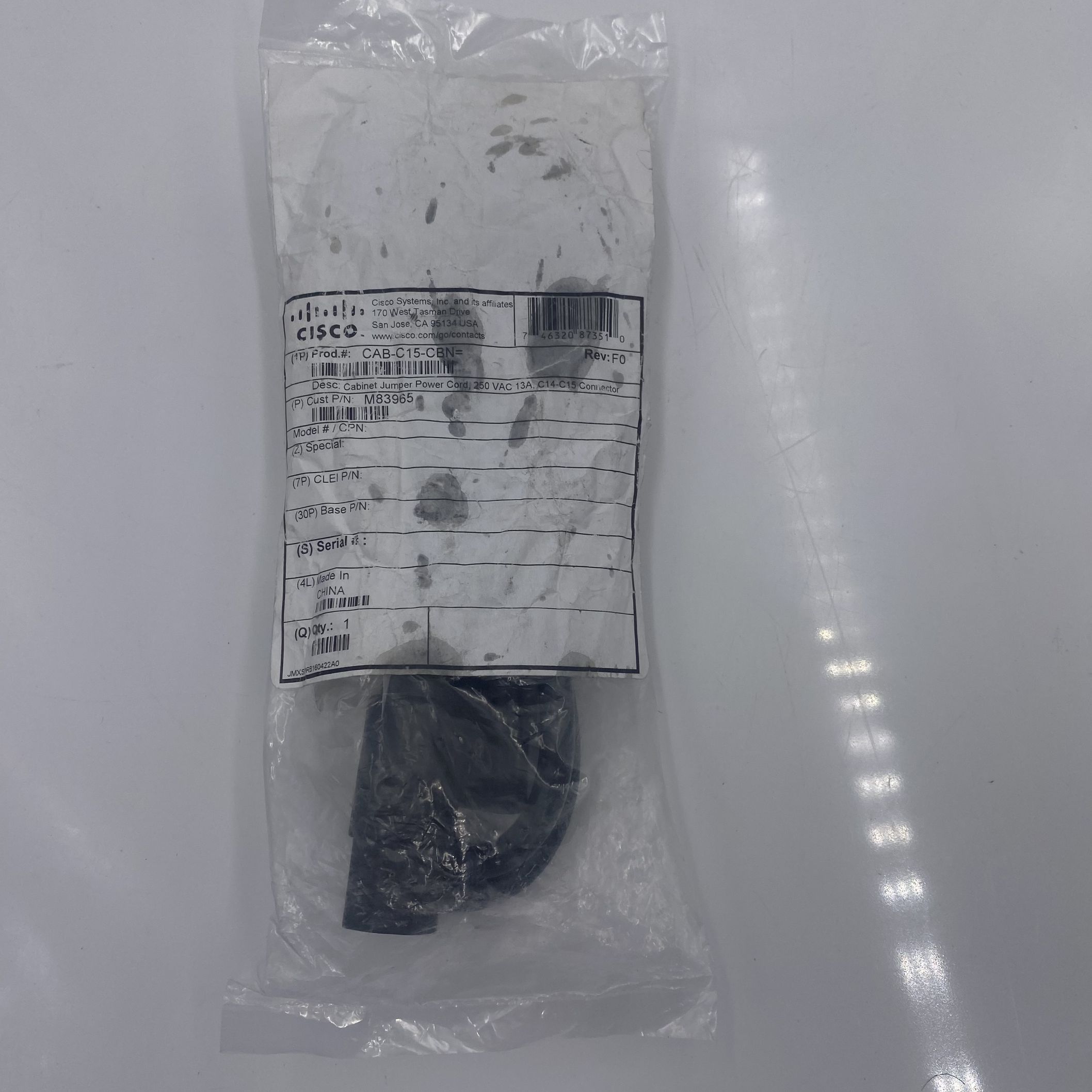CISCO Cabinet Jumper Power Cord, 250VAC 13A, C14-C15 CAB-C15-CBN
