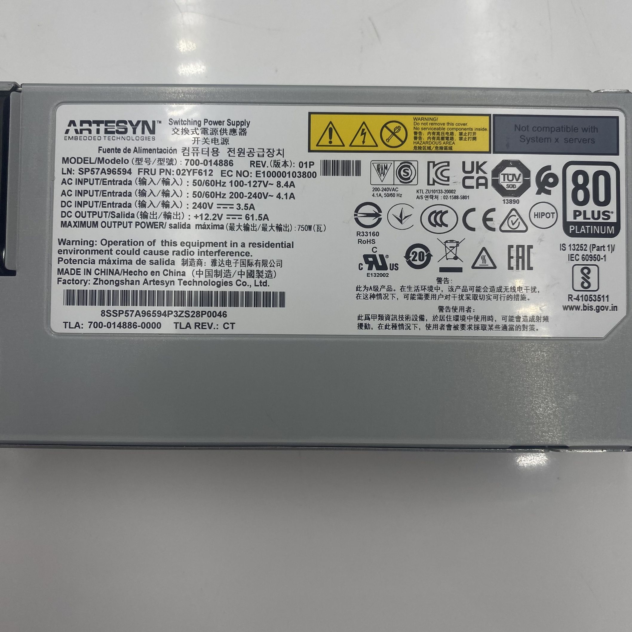 Lenovo Power Supply Artesyn 750W 230Vac/115Vac AC HS